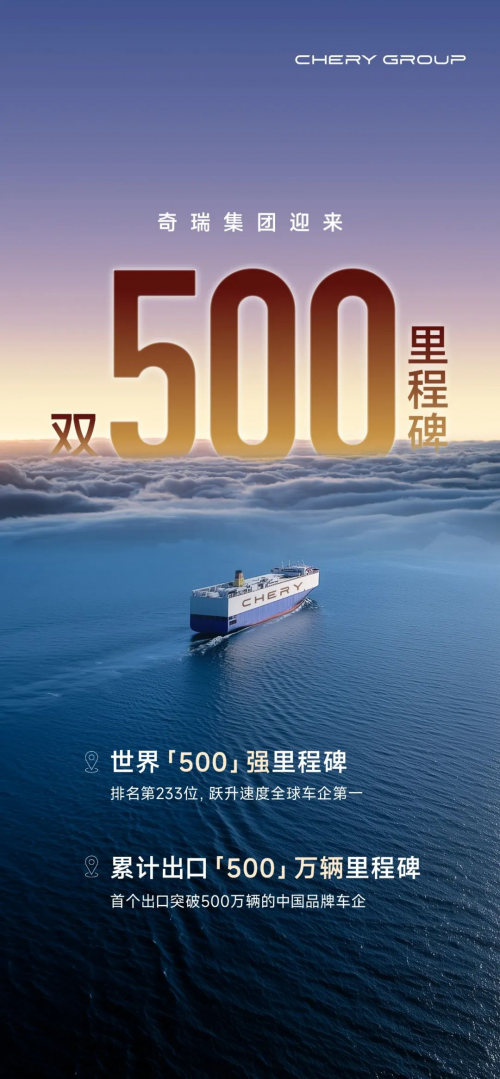得益于自身在海外市场的不断深耕,奇瑞全球化战略实现了突破性进展。今年以来,不仅连续保持中国车企出口第一的佳绩,更在其全球化发展历程中迎来“双500”里程碑——成为首个出口突破500万的中国品牌车企、世界500强年度跃升速度最快车企。这标志着奇瑞全球化战略实现突破性进展,迈入了加速品牌向上的全球化新时代。